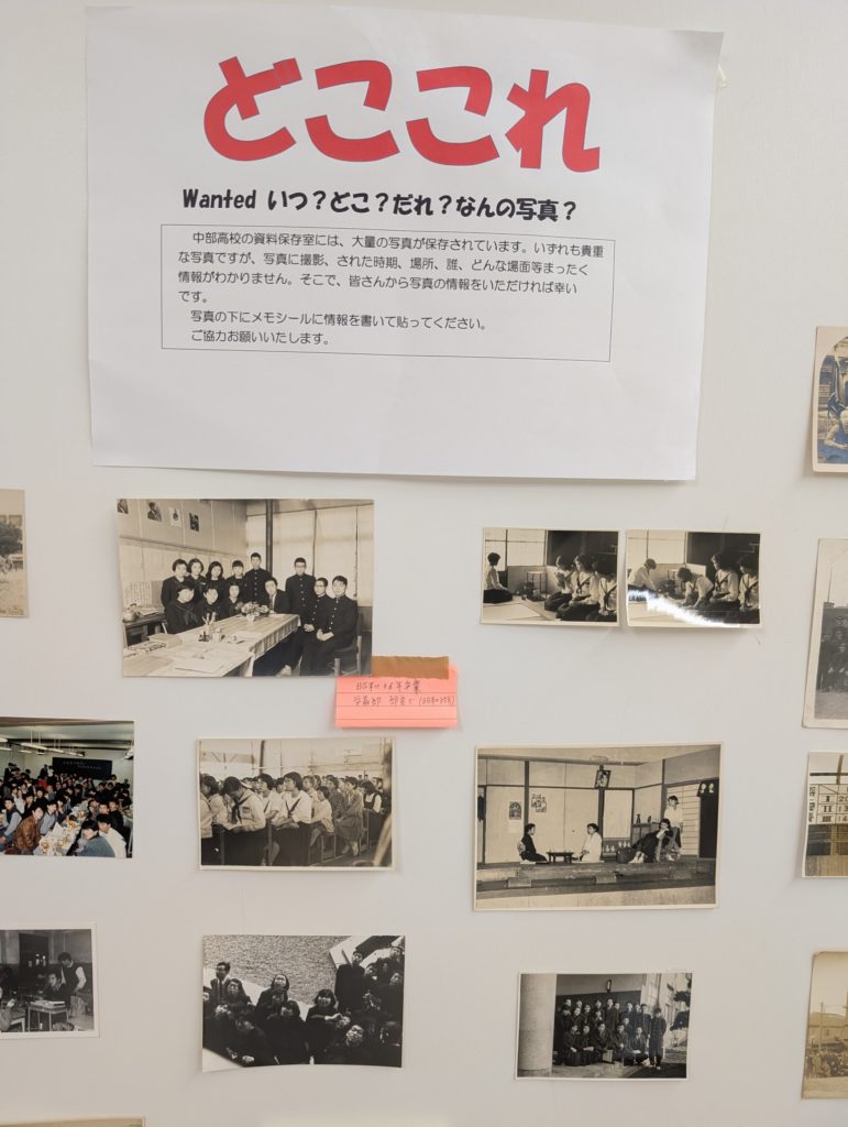 また、7階催事場の奥には、書道部が19日に書き上げた「白楊魂」の書が飾られており、その横に中部高校の「昔」であるお宝満載の資料、写真、アルバムが展示されています。